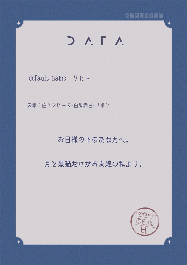 file1 file2 file3 ページ1 月と同じくらい真っ白な少女は1人誰もいない道を歩いていた。 時間は真夜中。彼女の仕事が始まる時間であり、彼女の唯一の居場所だ。 店の入り口を守るように丸まっていた黒猫に挨拶をして、少女リヒトは店内に入り開店準備へとりかかる。 準備を終えるのとほぼ同時に現れた人影にリヒトは怪しい笑みを浮かべ言う。 「ようこそ。あなたは誰にその不幸を届けたいの?」 ここは他人に不幸を贈ることが出来る場所。月が綺麗な夜、限られた人だけが訪れることのできるまっくらな場所。 ページ??? 今日の真夜中は雨だ。月は見えない。真っ暗は嫌い。あの子は無事だろうか。 私もお日様の下を歩いてみたかった。