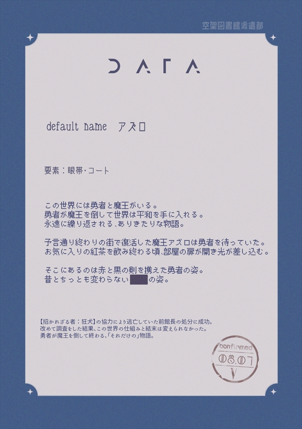図書館やセカイの管理からは逃れられない。それは図書館の職員も同じなのだと、白い男の後処理をしに来た黒い人形は言った。